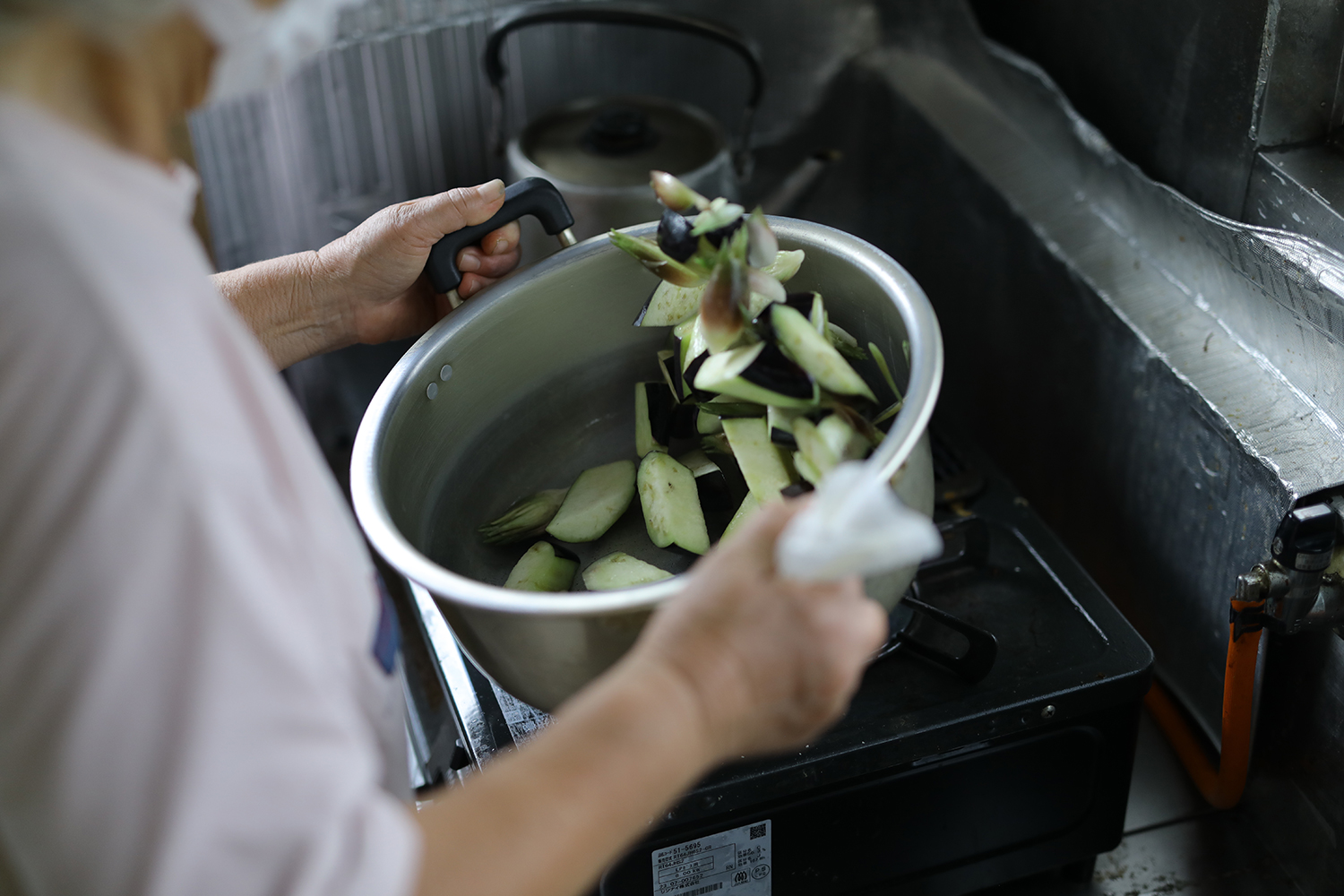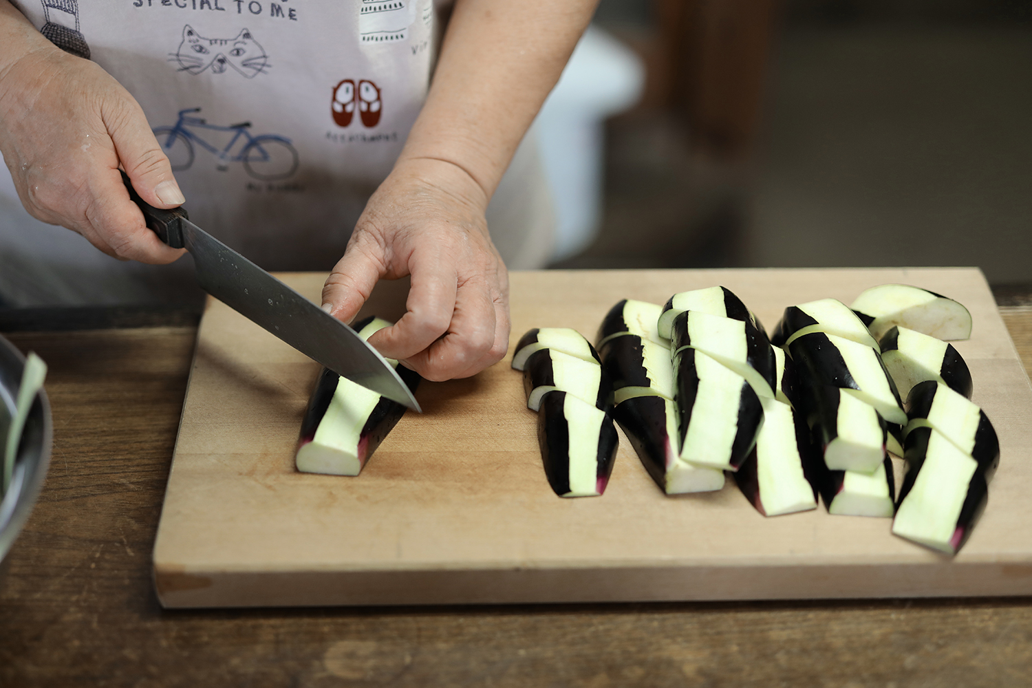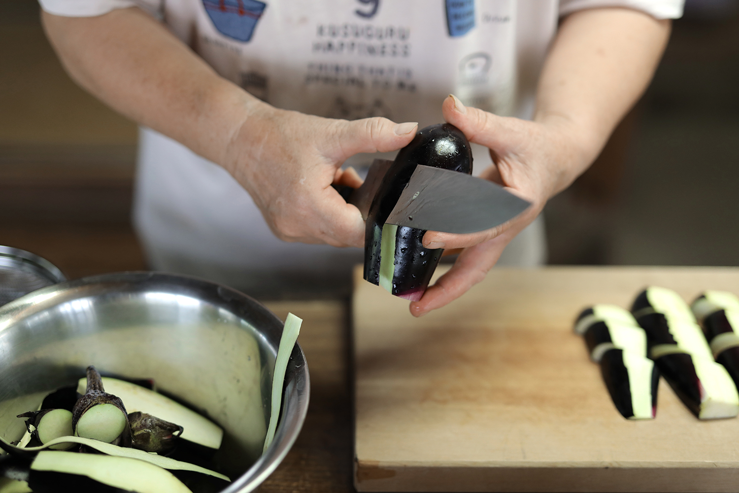 農家の小坂喜美子さんが志郎さんのところにお嫁に来た時に、お姑さんから教わったという「ミョウガと茄子の煮びたし」。味付けも簡単、調理も簡単。作り置きもできるので、たくさん茄子がある時はまとめて作っても。