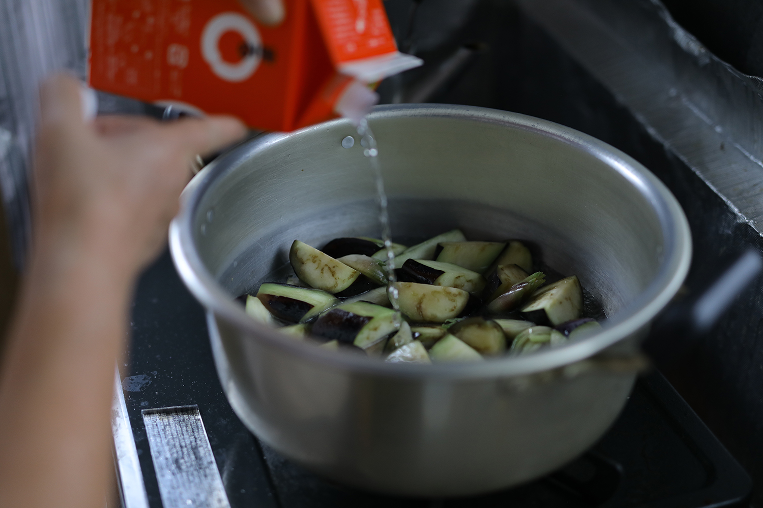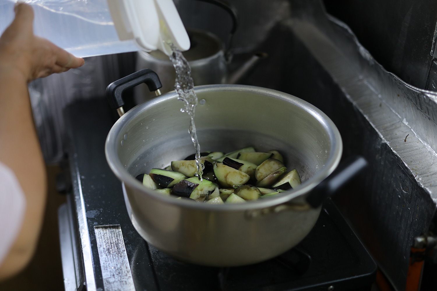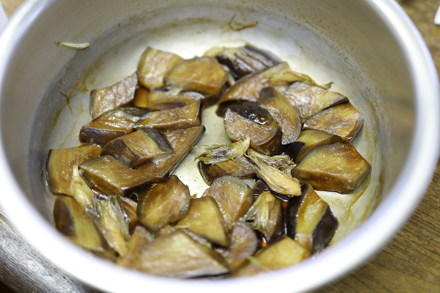 ④茄子に焦げ目がついたら、強火のまま、茄子がヒタヒタになるまで、お水をまわし入れる。
