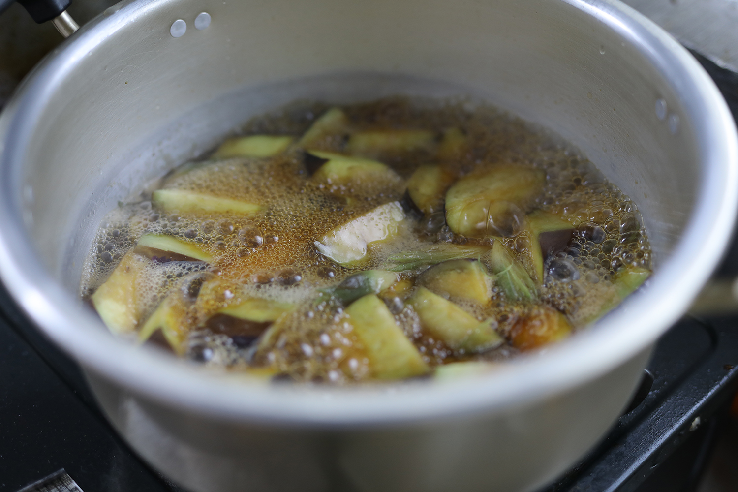 ⑦煮汁が茄子に染み込んで、水分がなくなったらできあがり。
