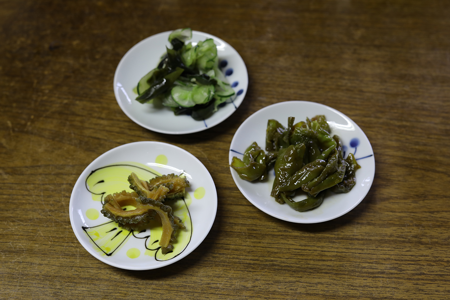 きゅうりとわかめの酢の物、ゴーヤの佃煮、ししとうの煮びたし。どれもシンプルで野菜本来の味を感じる逸品でした。