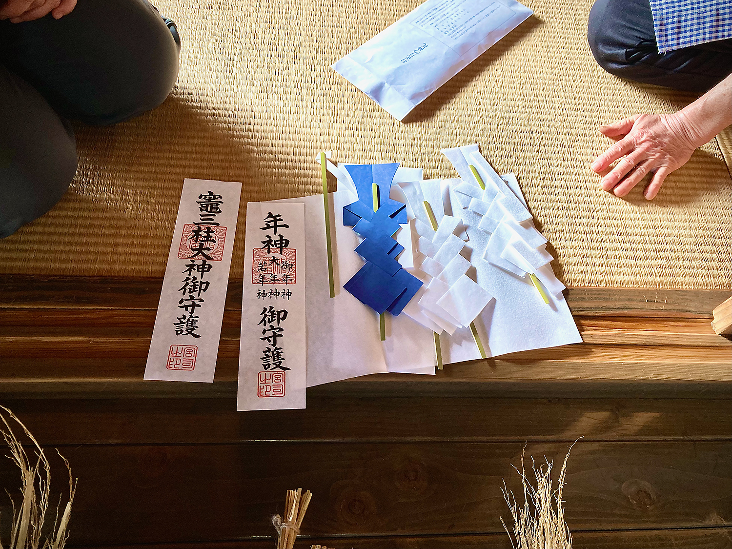 土間の板の間に並んだしめ縄飾りは、右から順番にお稲荷さん、お台所、作業場やビニールハウス、玄関、門、と、それぞれ飾る場所が決まっています。森さんのおじさまが毎年手作りなさっているそうです。そして、小比企稲荷の氏子さんたちは、年神様をお迎えするお札とと竈(台所)のお札を飾るとのこと。「年神さまはこちらから詣でなくても、神さまのほうからそれぞれの家々に来てくださるんですって」と森さん。床の間には、お孫さんといっしょに作ったという自家製のお供え餅が並んでいました。
